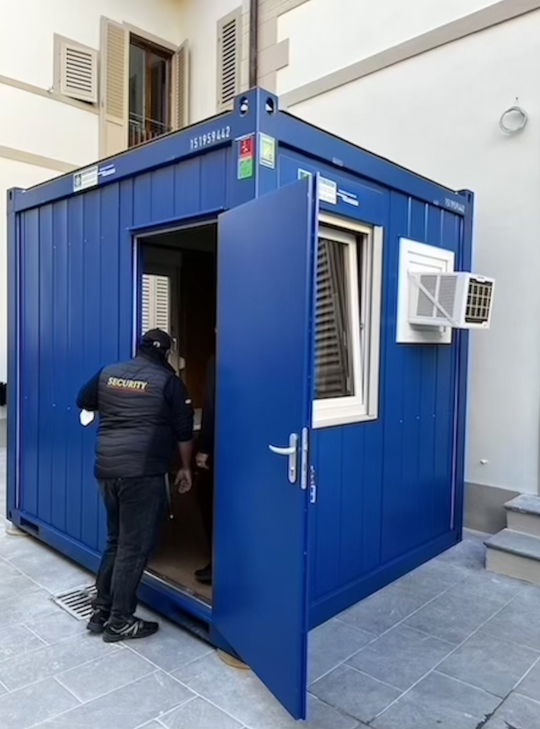 BM10' Appena posizionato a terra in centro a Firenze con l’attenzione e la rapidità dei nostri gruisti sarà utilizzato come postazione di sorveglianza H24. Il collegamento elettrico immediato, condizionatore a parete, finestre su ogni lato e passaggio cavi per impianto tvcc sono le priorità per la nostra clientela a noleggio.Gori Container Srl rivenditore autorizzato Containex.